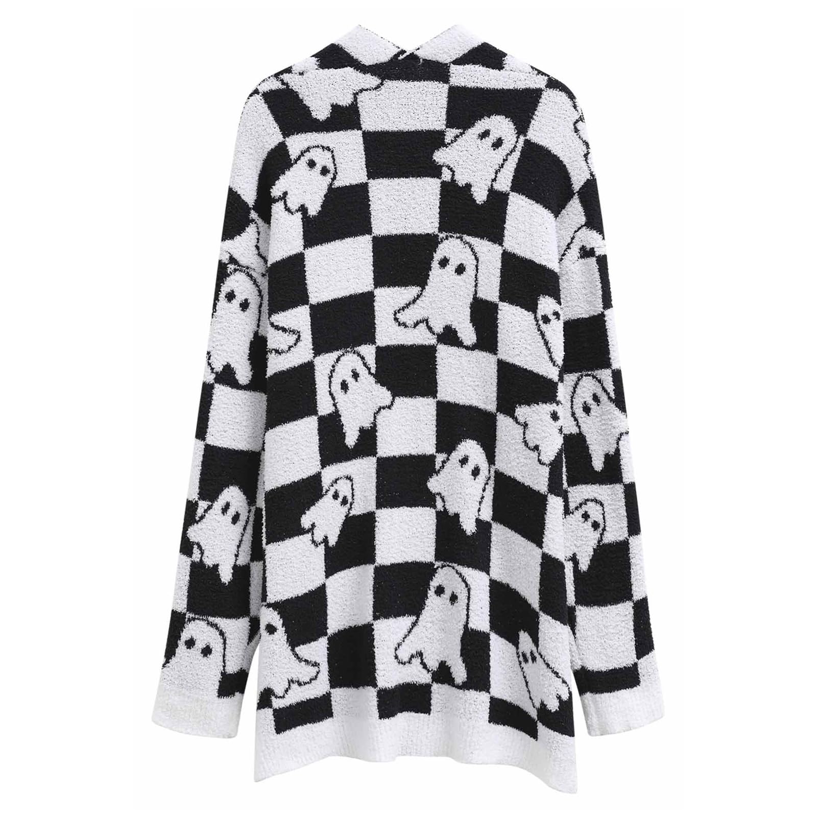 CHICWISH Women Checkered Ghosts Print Open Front Knit Cardigan Casual Long Sleeve Halloween Party Knit Sweater Coats