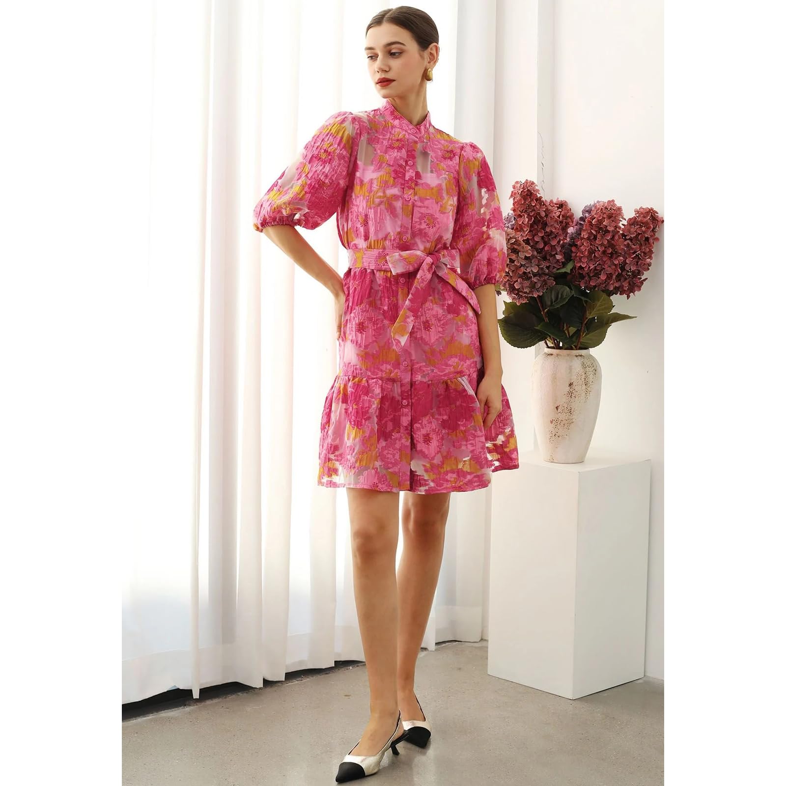 - [ Style Details ] Exuding vintage charm, the Floral Jacquard Puff Sleeves Organza Buttoned Belted Dolly Dress is a statement piece. Featuring delicate floral jacquard fabric and puff sleeves, it brings a whimsical, feminine feel. The buttoned front and self-tie bowknot at waist add structure, while the overall design radiates playful elegance, making this dress an ideal choice for special occasions or stylish daywear.