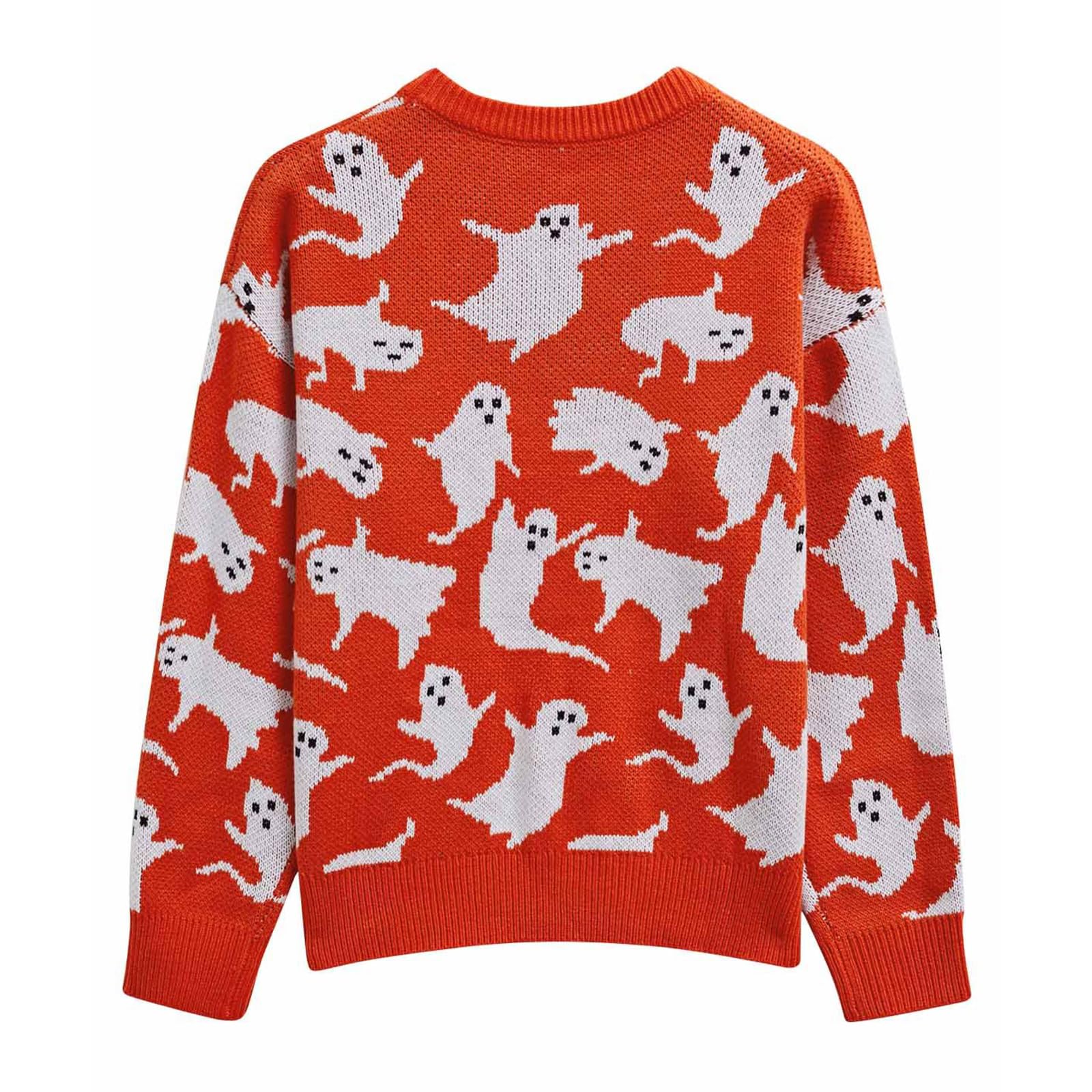 • [ Style Details ] This sweater features a charming ghost pattern that brings a touch of seasonal fun to your wardrobe. Playful little ghosts scatter across the sweater, as if dancing through a cheerful Halloween party. Designed with a classic round neck and relaxed dropped shoulders, it offers both comfort and effortless style. The casual yet distinctive design makes it a versatile piece you’ll reach for throughout the season.