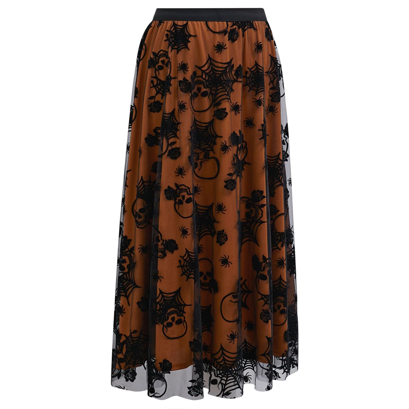 CHICWISH Women Halloween Skull Mesh Tulle Skirt Elastic Waist A-Line Halloween Party Spider Web Layered Midi Skirt
