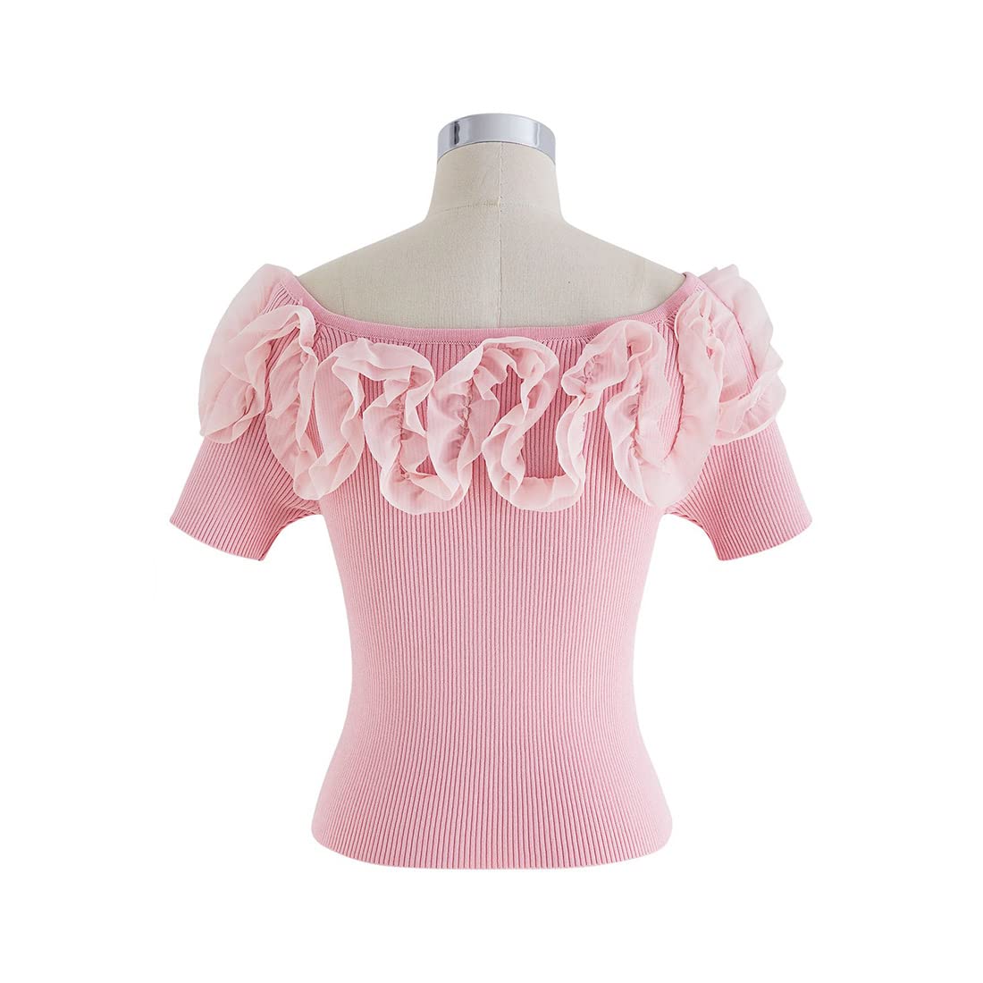 - [ Product Details ] - Cropped length - Boat neckline - Ruffle mesh trimming - Knit fabric provides flexibility - Not lined - 100% Acrylic - Hand wash cold