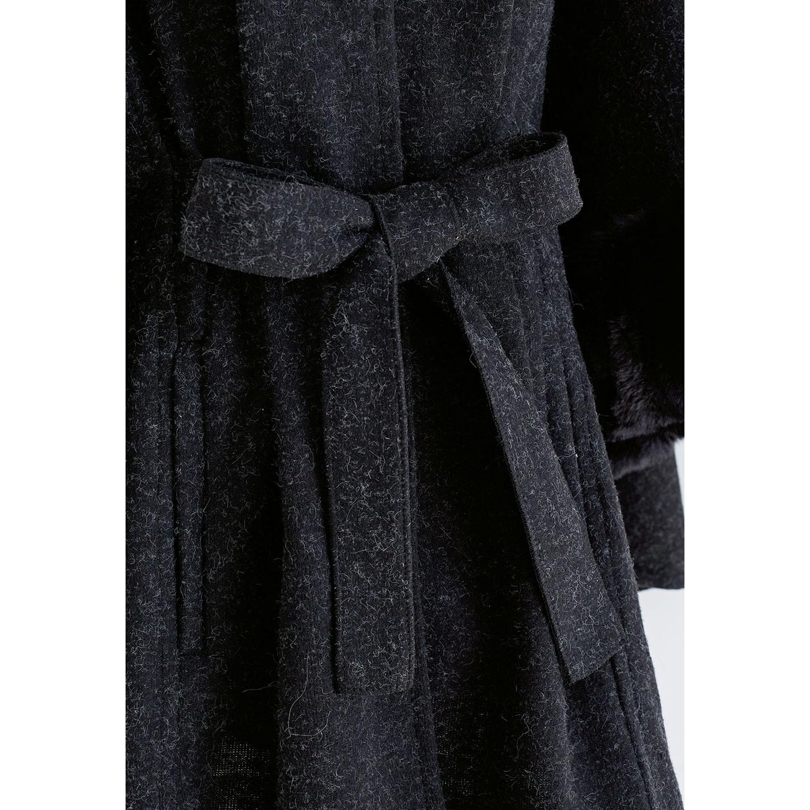 - [ Product Details ] - Faux fur trimmed - Side pockets - Self-tie sash accompanied - Hook closure - Not lined - 100% Acrylic - Hand wash cold