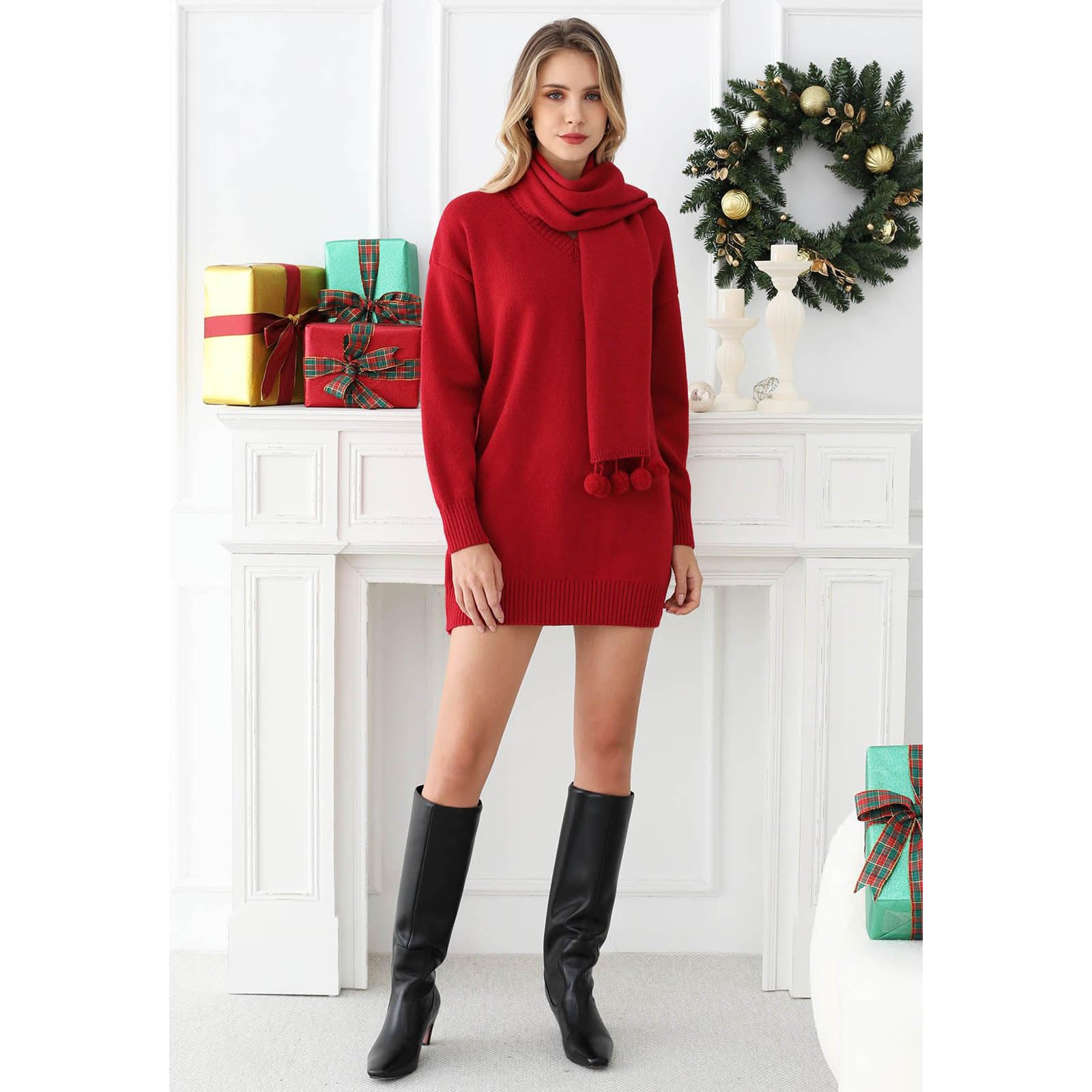 CHICWISH Women V Neck Knit Sweater Dress Long Sleeve Soft Casual Trendy Holiday Pullover Mini Dress with Pom-Pom Scarf